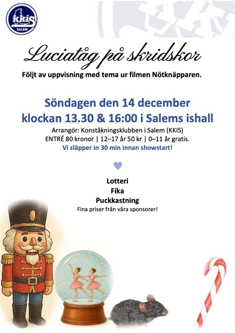 Välkomna att komma och titta på KKIS populära Julshow inklusive Luciatåg i Salems ishall söndagen den 14:e december. Showstart klockan 13.30 samt 16.00.